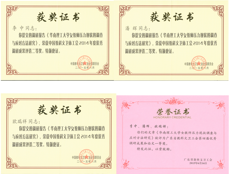 2015年6月,由图书馆数字资源部的李中,潘辉,欧瑞祥老师共同完成的调研成果《华南理工大学女教师压力现状调查与应对方法研究》喜获中国教科文卫体工会调研报告二等奖,据悉中国教科文卫体工会从全国推荐的论文与调研报告中,经全委初评、复审以及评委会评定,最终评选出调研报告一等奖5篇,二等奖13篇,三等奖15篇,优秀奖24篇;在此之前,该调研报告还获得广东省教科文卫工会第四届优秀调研成果和论文一等奖。