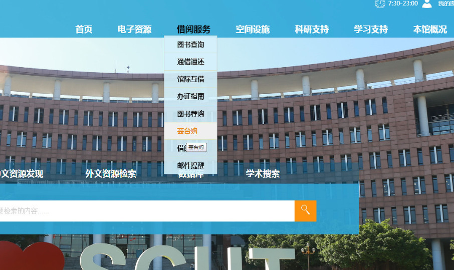 “芸台购”图书借购服务平台于6月16日正式启用,欢迎各位师生登陆自助选购。该平台提供海量国内版新书,支持24小时线上自助下单,是一种新型的线上借购图书、线下还书、实行图书馆买单、快递到家、零运费的开放式借购平台, 读者可以直接在线选购心仪图书,经图书馆审核通过后,图书快递发货,即选即借,直接快递到读者手中,和您网购一样简单!只要在规定借期内归还到馆即可。